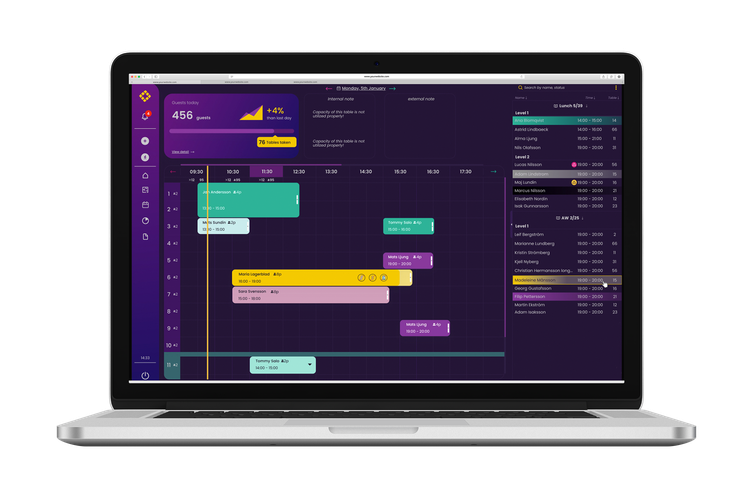 TrueBOOKING erbjuder smarta funktioner såsom aviseringar för försenade gäster, vyer över bord som sitter längre än planerat, anpassningsbara widgets för onlinebokningar, pedagogisk administratörsvy och offline-läge.